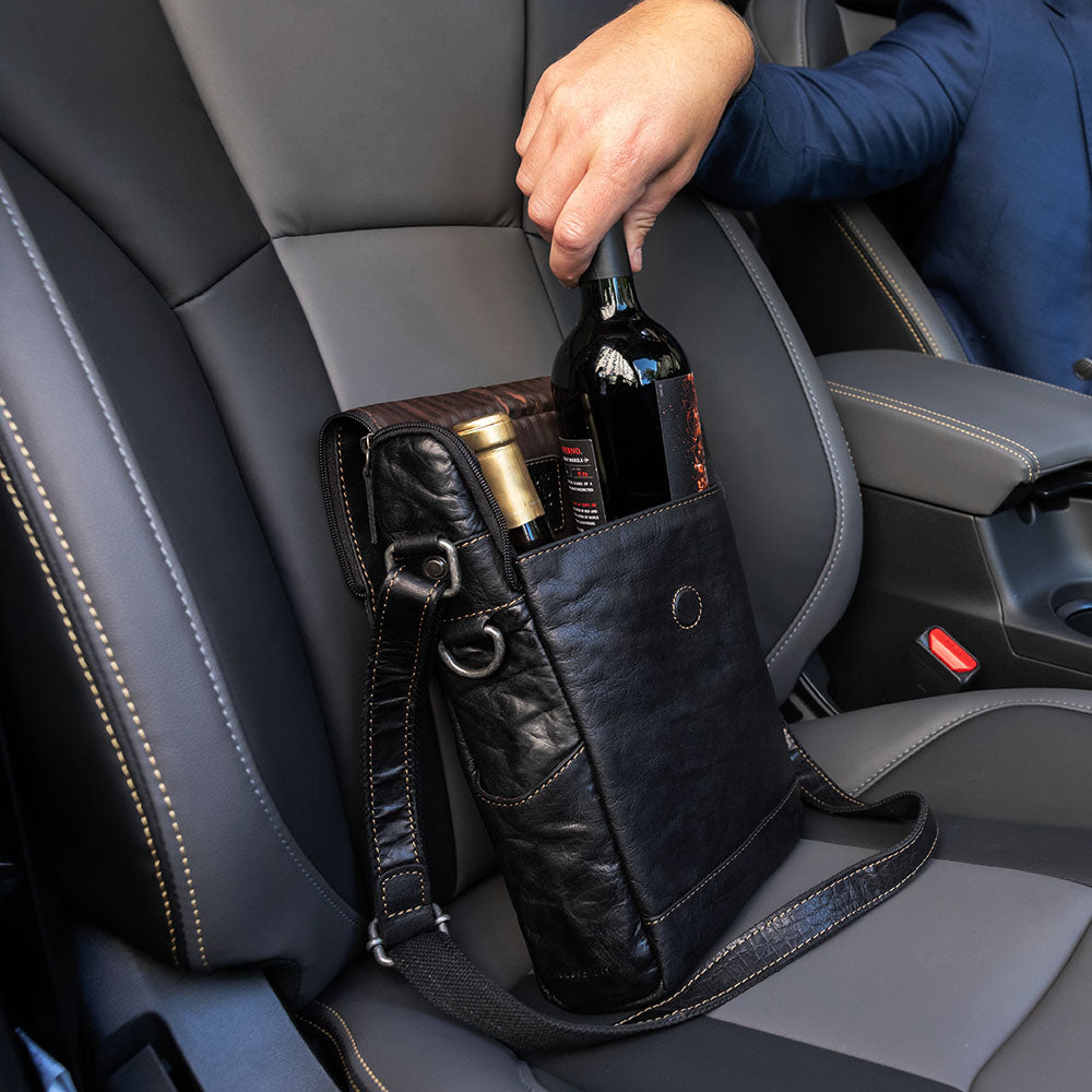 This bag is a cross body messenger and a wine bag in one. As a wine bag, it offers a sophisticated way of transporting two bottles of your favorite wines for a dinner engagement or special event, keeping them safe and secure inside. Or you can choose to carry a single bottle of wine and two glasses. Open pockets on the gussets are the perfect place to put a corkscrew, drip ring, or bottle stopper.