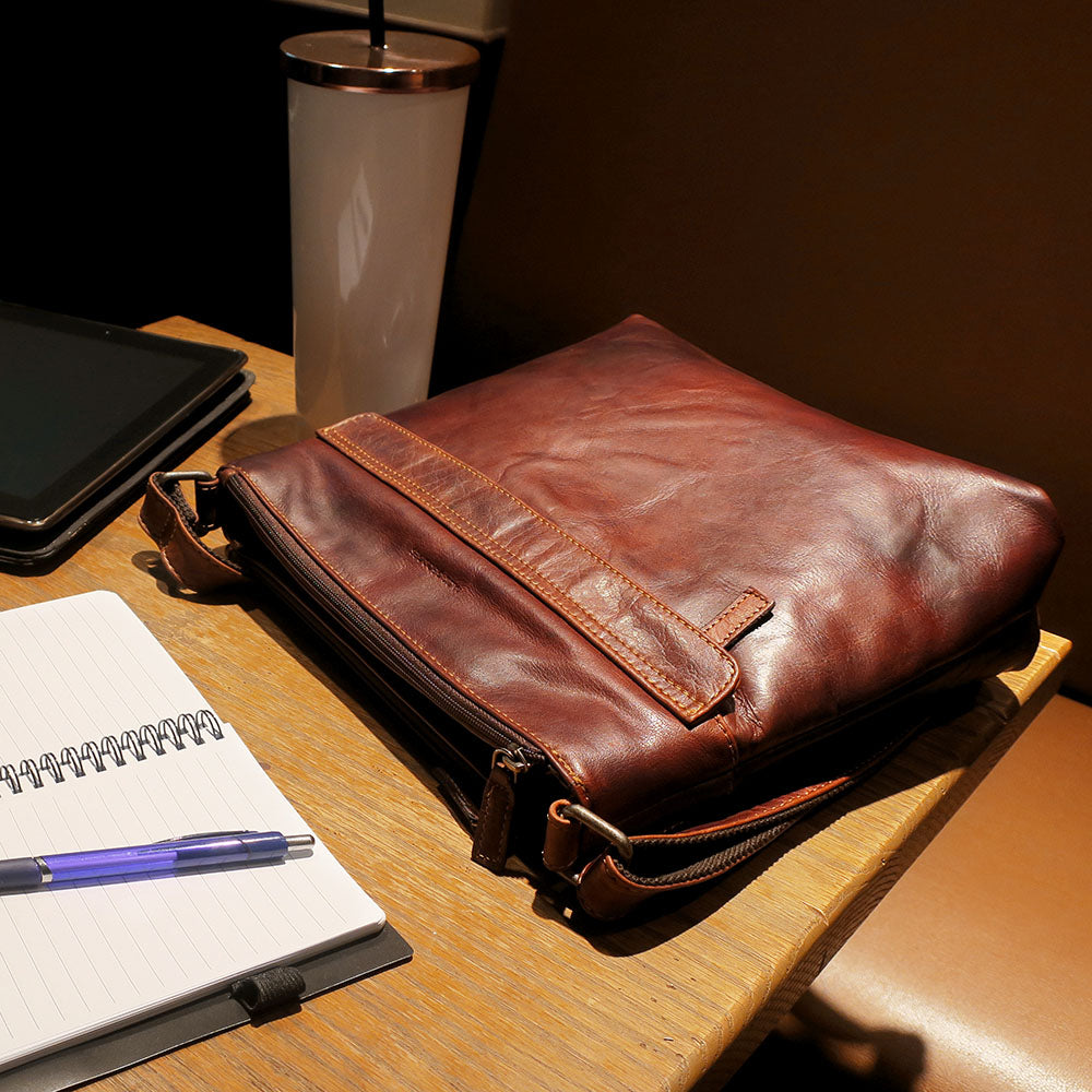 Designed to keep your things organized and accessible whenever you're away from home – this bag is all about function and clean styling. The bag features two top zippered compartments and an open section with magnetic closure in the middle that allows for easy access to everything that you need to have quick access to. The zippered front and back pockets will hold your keys, mobile phone, wallet, or passport and documents when you're traveling. An adjustable shoulder strap allows the bag to be carried on the shoulder or across the chest. This hand made leather bag features: